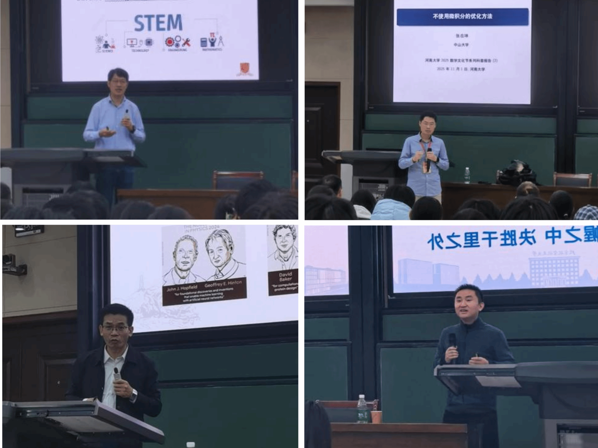 此外,在会议期间,苏文藻教授、张在坤教授、夏勇教授和朱利平教授应邀参加了河南大学的数学文化艺术节,并为本科生们奉献了四场精彩的科普报告。通过这些报告,四位教授不仅向学生们介绍了各自领域的最新研究成果,还深入浅出地讲解了数学及相关学科的实际应用,极大丰富了艺术节的内容。