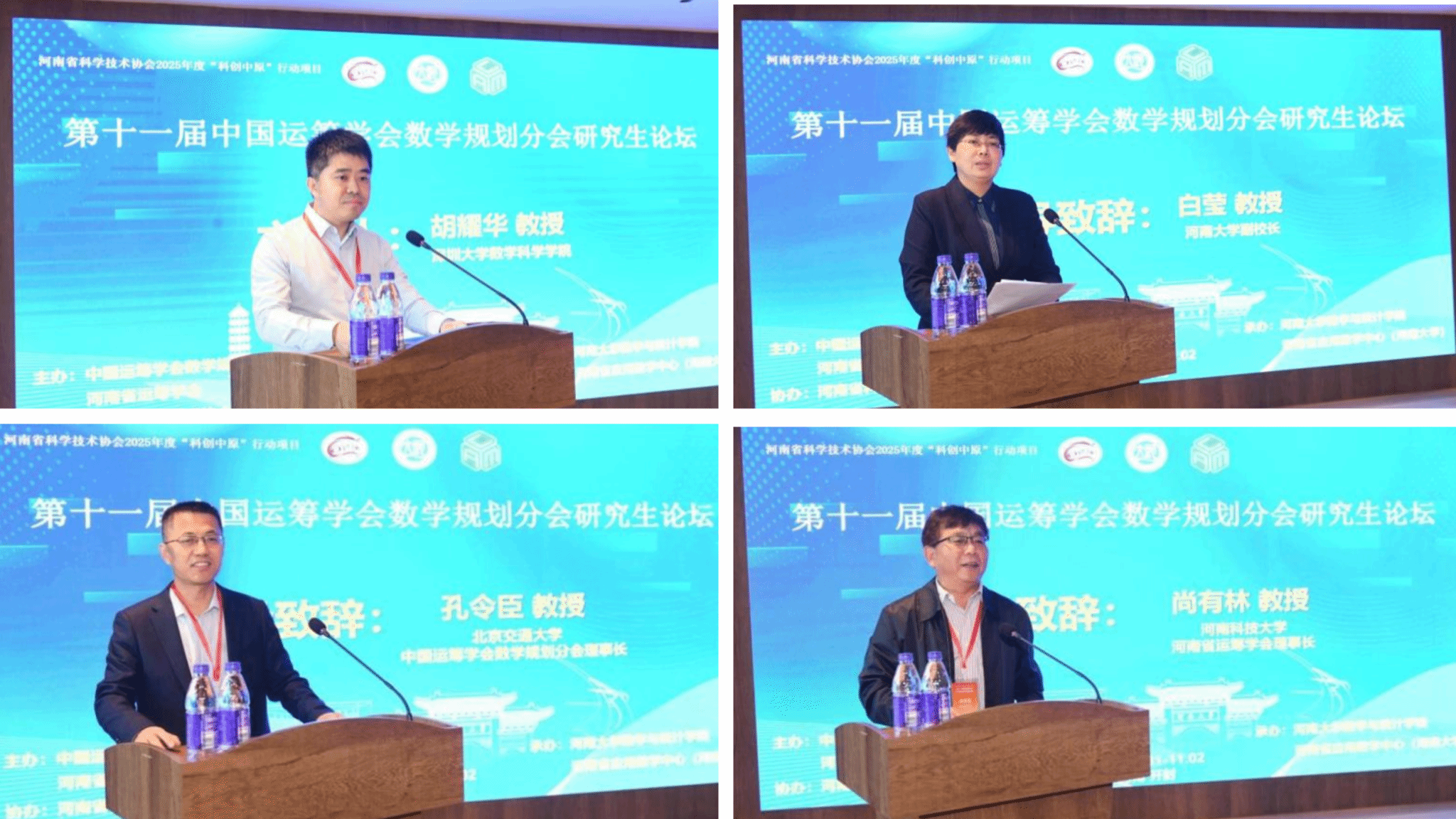 开幕式由中国运筹学会数学规划分会青年支部主任、深圳大学的胡耀华教授主持。河南大学副校长白莹教授、数学规划分会理事长孔令臣教授、河南省运筹学会理事长尚有林教授等领导分别致辞。白莹在致辞中向来自各地的专家学者和青年学子表示热烈欢迎和诚挚问候,并介绍了河南大学在数学学科建设、科研创新以及研究生培养方面取得的显著成就。她强调,本次论坛对促进校际学术交流、推动青年学子成长具有重要意义,并期望各位专家学者能为青年学子提供更多指导和帮助,助力河南大学在人才培养和学科建设上取得新的突破。孔令臣在致辞中表示,希望与会者能够在论坛中汲取学术营养,碰撞思想火花,为数学规划领域的发展注入青春动力。尚有林结合地方学科发展的需求,鼓励青年研究者扎根应用,服务实践,推动学术成果的转化与落地。