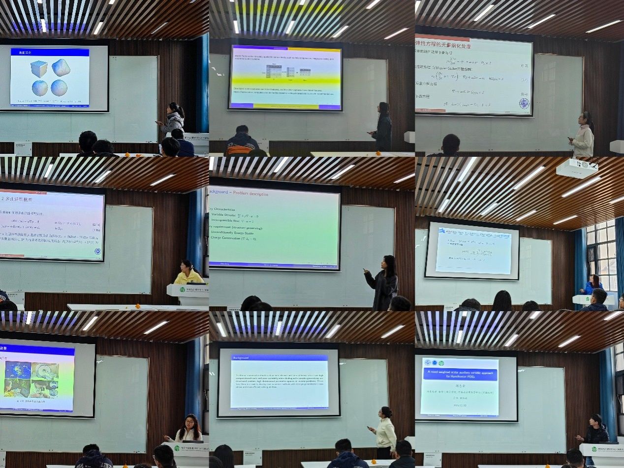 本次沙龙共设置了18场研究生学术报告,报告内容覆盖多孔弹性问题的数值方法与物理驱动深度学习算法、优化算法及流形优化问题、流体与磁流体动力学高阶数值格式、图像重建与分割的数学模型、矩阵分解与变量选择等多个应用数学前沿研究方向,呈现出学科交叉融合、理论与应用并重的鲜明特点。学术报告会上,何亚南、谢航、李慧芬、马蒙、王迎伟、王承新、王书奇、董晓月、黄瑞瑞、史梦娇、秦琪、徐晓晴、陈梦迪、宋碧洁、李沛酝、李彬倩、冯颖娜、刘志豪18位研究生依次报告,从不同研究视角分享了各自的科研进展与学术成果。