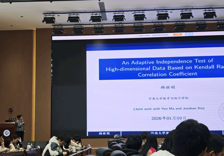 韩丽娟的报告题目为《An Adaptive Independence Test of High-dimensional Data Based on Kendall Rank Correlation Coefficient》。该项研究主要考虑了基于Kendall秩相关系数对高维数据的独立性假设检验问题。针对高维数据检验问题,经典的两类检验统计量为U型检验统计量和极值型检验统计量,U型检验统计量在稠密备择假设下渐近功效较高,收敛速度较快;极值型检验统计量在稀疏备择假设下渐近功效较高,收敛速度较慢。由于实际情况中真实备择假设未知,如何选择在各种类型备择假设下始终能保持高检验功效的检验方法是高维统计推断的重要问题。本研究创新性地提出了一种结合U型和极值型检验统计量的自适应功效提升检验方法,从理论分析、数值模拟和实例分析三方面验证了所提新方法在控制犯第一类错误的前提下,能在不同类型的备择假设(包括稠密、稀疏、中等稀疏)下均保持高检验功效。该项工作因其显著的创新性与精彩的展示,得到了评审专家的高度评价。