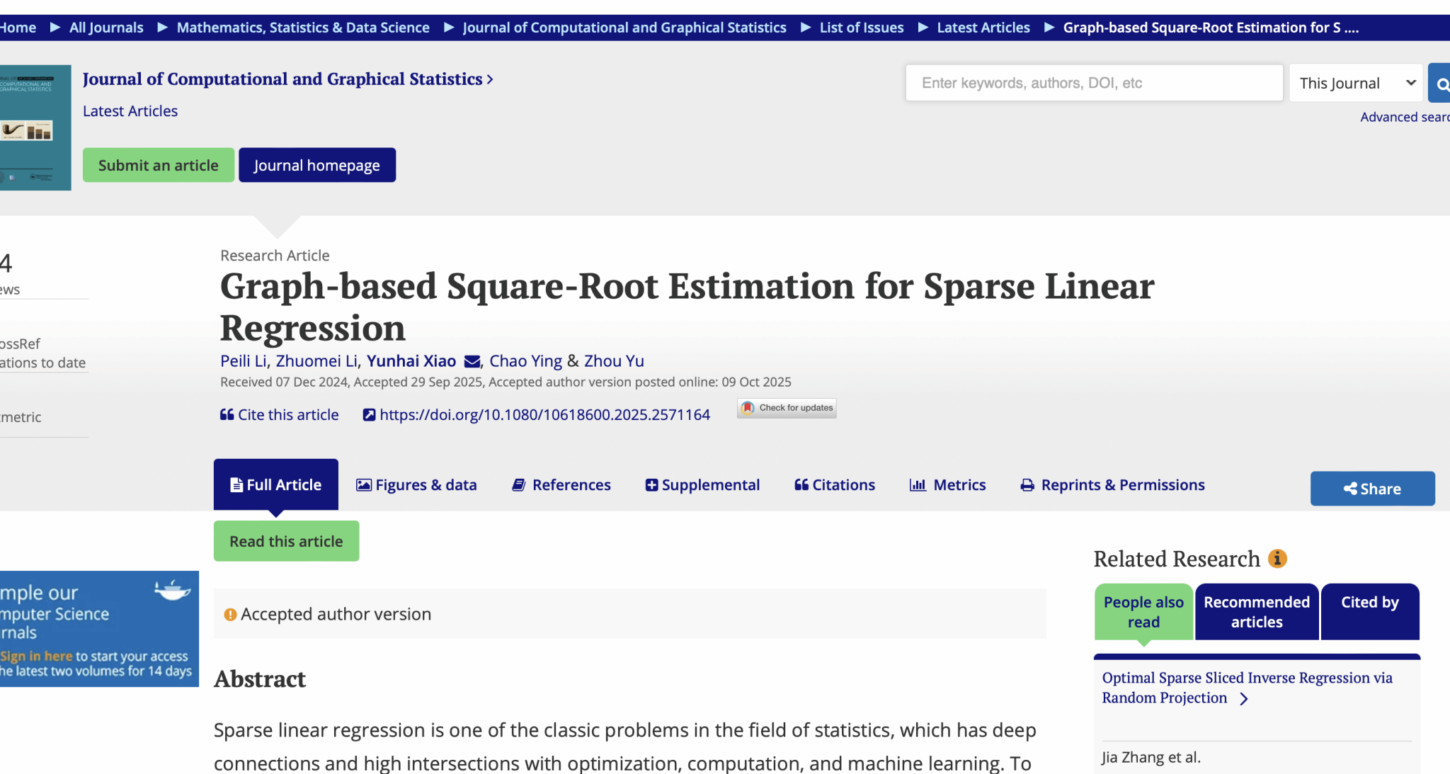 此外,本项研究成果得到中国运筹学会官方微信公众号“运筹动态”栏目,于2025年10月22日第247期宣传报道。本项研究成果得到了国家重点研发项目、国家自然科学基金项目、河南省自然科学杰出青年基金项目等资助。全文链接(订购):https://www.tandfonline.com/doi/full/10.1080/10618600.2025.2571164