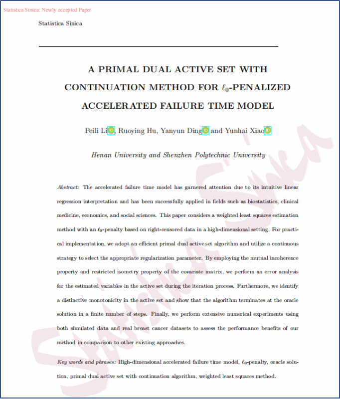 近日,河南大学肖运海教授、李培丽副教授与研究生胡若影组成的团队,在国际统计学权威期刊《Statistica Sinica》在线在线发表题为《A primal dual active set with continuation method for l0-penalized accelerated failure time model》的论文。