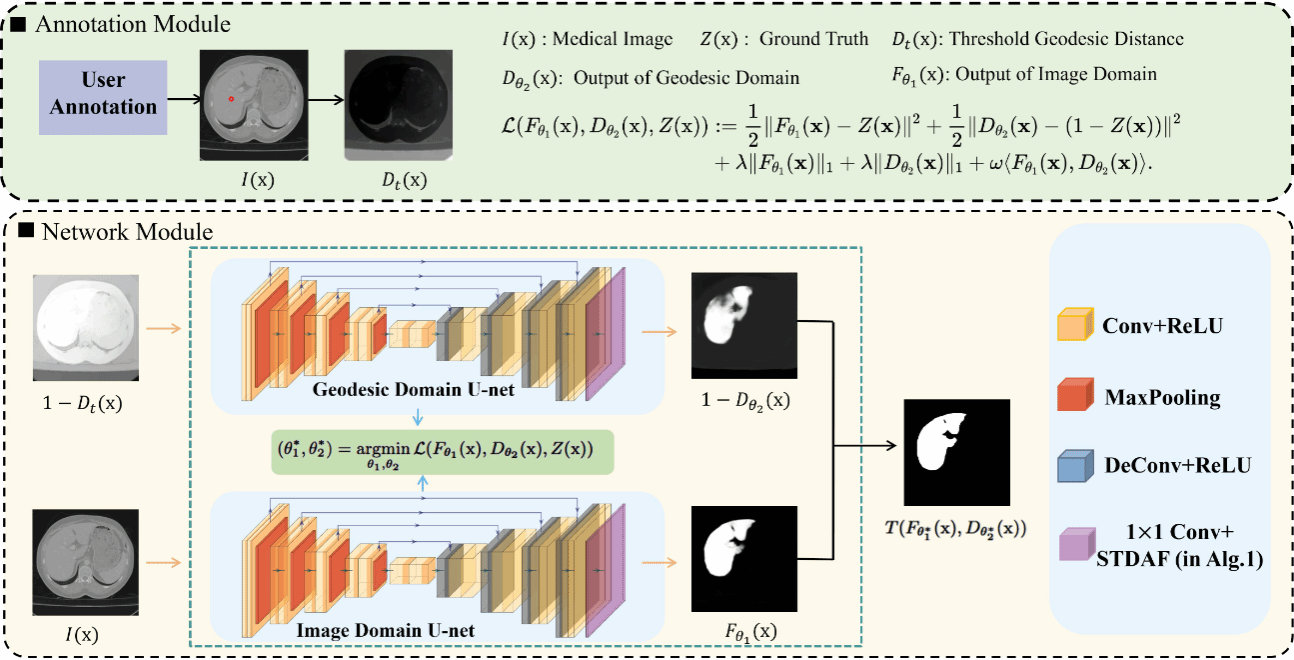 医学图像选择性分割旨在从复杂图像中准确提取特定感兴趣区域,在辅助诊断和治疗方案制定中具有重要意义。现有交互式分割方法往往依赖较多人工标注点,限制了方法的实际应用效率。针对上述问题,论文从偏微分方程与深度学习交叉融合的角度出发,提出了一种双域驱动Unet方法。该方法基于Eikonal方程将标记点转化为阈值测地线距离,并将图像域信息与测地线距离域信息共同纳入统一网络框架。所提网络通过双分支Unet分别学习图像结构特征与几何距离特征,从而增强对目标区域与背景区域的区分能力。此外,研究团队推导出sigmoid激活函数的变分形式,把传统活动轮廓中的边界长度惩罚转化为网络中可迭代求解的空间正则化过程,从而进一步提升了分割结果的准确性与鲁棒性。