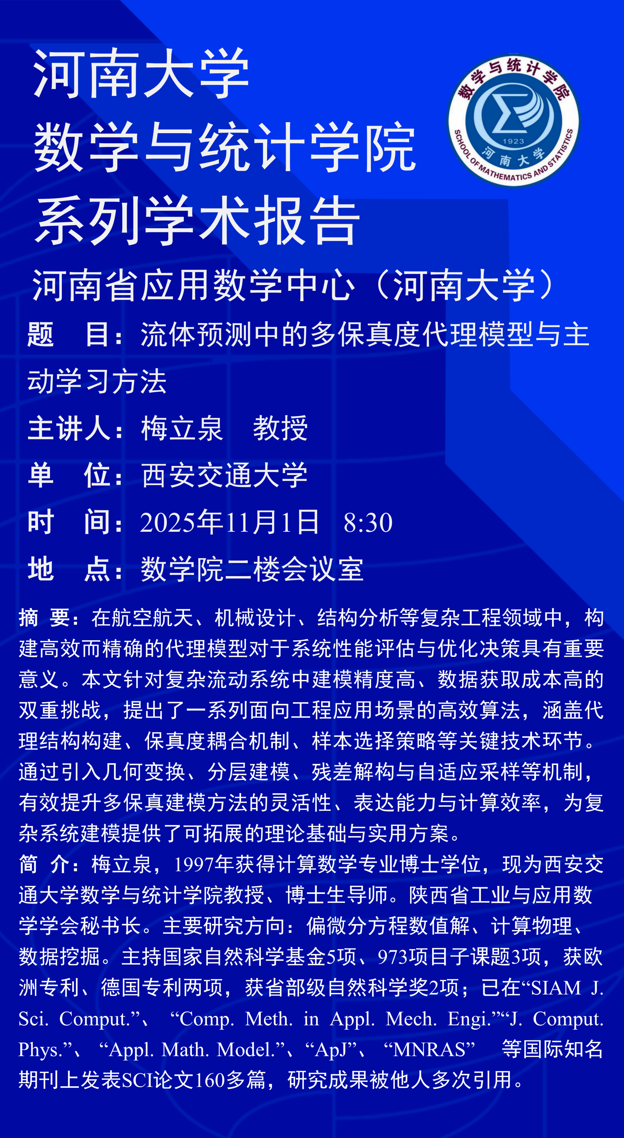 简 介:梅立泉,1997年获得计算数学专业博士学位,现为西安交通大学数学与统计学院教授、博士生导师。陕西省工业与应用数学学会秘书长。主要研究方向:偏微分方程数值解、计算物理、数据挖掘。主持国家自然科学基金5项、973项目子课题3项,获欧洲专利、德国专利两项,获省部级自然科学奖2项;已在“SIAM J. Sci. Comput.”、 “Comp. Meth. in Appl. Mech. Engi.”“J. Comput. Phys.”、 “Appl. Math. Model.”、“ApJ”、 “MNRAS” 等国际知名期刊上发表SCI论文160多篇,研究成果被他人多次引用。
