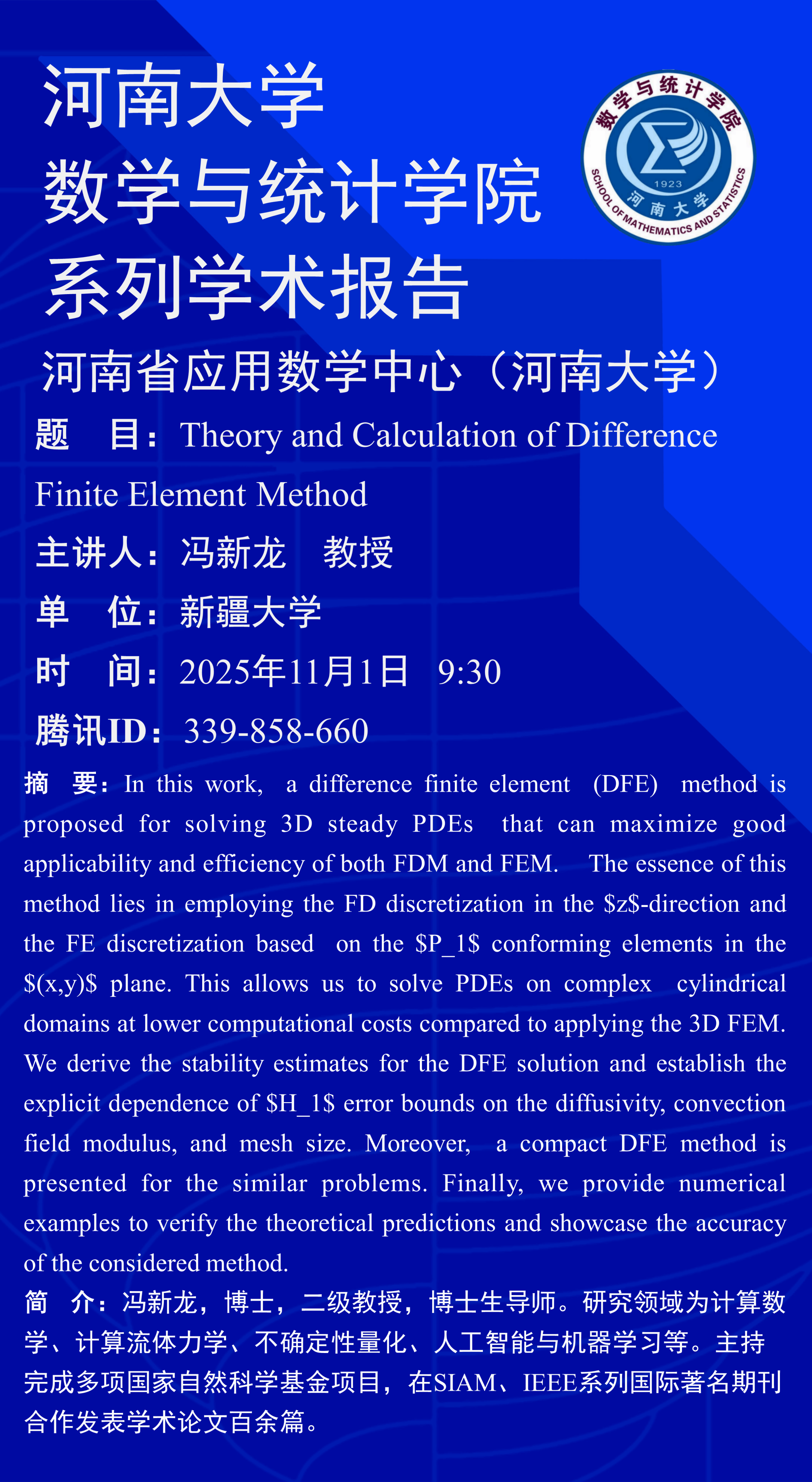简 介:冯新龙,博士,二级教授,博士生导师。研究领域为计算数学、计算流体力学、不确定性量化、人工智能与机器学习等。主持完成多项国家自然科学基金项目,在SIAM、IEEE系列国际著名期刊合作发表学术论文百余篇。
